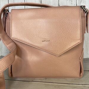 Main compartment with magnetic snap closure, front slip pocket compartment with asymmetric flap, and back zippered compartment.