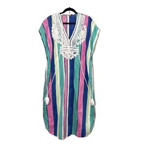 Matta Kaftan Midi Dress Striped Multicolor Cotton Rainbow Embroidered One Size