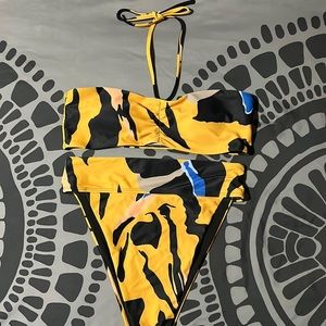 Matte Collection bikini. Brand new, never worn, comes in original bag. Bandeau top with removable tie. High waisted, high leg cut bottom.