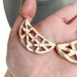 Matte Gold Tone Lattice Geometric Scalloped Statement Necklace. In gently preowned condition with a few very small scratches on the front pieces. Cable chain with a lobster claw closure and extender. Unbranded and no markings.