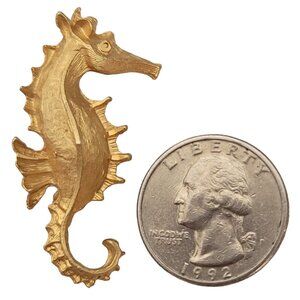 This exceptional Seahorse Pin Brooch has an awe-inspiring look and will make a stylish choice for most occasions. A distinct matte gold tone pin that depicts a three-dimensional seahorse, an amazing sea creature displaying intricate detail of a textured shape including a curled tail, dorsal fin, and long snout, giving a distinctive look and dramatically displaying life-like details. It measures approximately 1.7 inches in length. Finished with a secure locking pin that functions properly. The pin closure is sturdy and fixed ensuring that it stays securely attached to your clothing or accessory throughout the day.