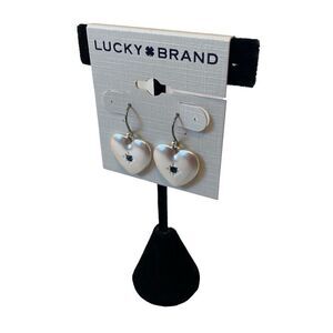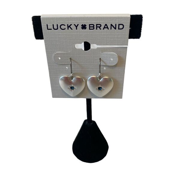 Matte Silver Heart Shaped Drop Earrings w/ Dark Blue Centered Pave Crystal