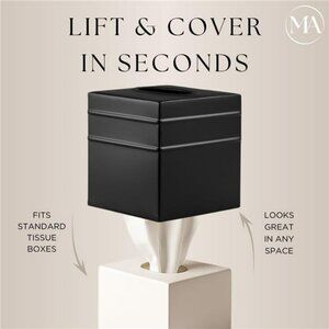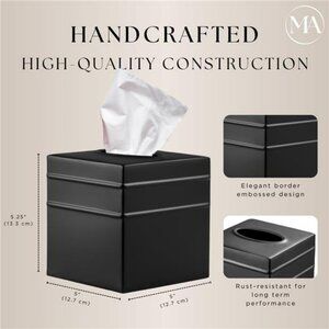 🧿STYLISH & PERFECTLY SIZED: Measuring 5" x 5" x 5.25", this square tissue box cover delivers the perfect blend of elegance and functionality. The sleek design of this black tissue cover complements any room—whether you're decorating a modern bathroom, cozy bedroom, or organized office. Use it as a decorative tissue box holder to enhance countertops, vanities, nightstands, desks, or side tables.