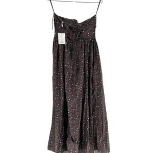 Matteau Strapless Printed Brown Cotton Gathered Maxi Dress Size 4: a strapless, gathered bodice with adjustable ties at the back, this dress showcases a floaty skirt, convenient pockets, and an abstract leaf print, measurements: 14.5 inch bust x 46.5 inch length.