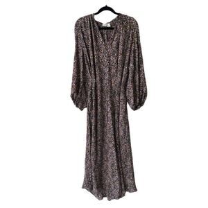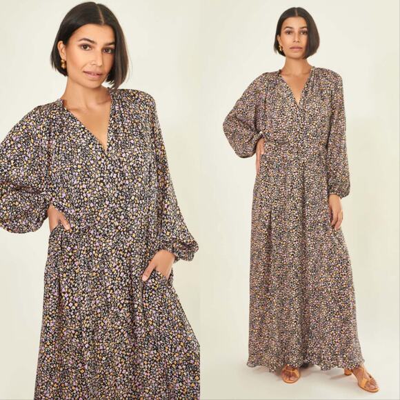Matteau Voluminous Tunic Floral Maxi Dress in Wild Primrose. Size 1 = US 2. Fits oversized, can fit up to a medium. Features billowing maxi floor length, allover purple and orange floral print, side splits in skirt, square mandarin collar and deep vneck, long sleeves with elasticated cuffs, side pockets, loose fit, unlined, long length. 100% silk. Great used condition, no notable flaws. Retail $750.