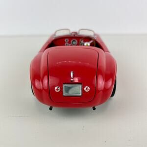 This 1:18 scale diecast car is a classsic italian sportscar. The trunk opens to show the spare tire, the hood opens to show the powerful Ferrari engine and the interior of this car is tan.