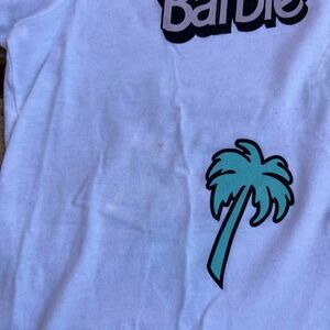 Pink Barbie Logo & teal Palm Tree on white women’s Bella + Canvas V Neck tee! Size S. I may have worn this shirt once but I don’t think I ever did. It is new or like new. However there are a few small stains as pictured from storage. They are very small and might be able to come out.