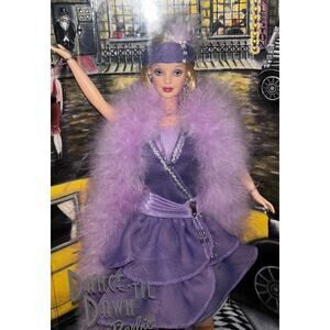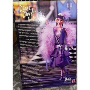 This listing is for a Barbie Great Fashions of the 20th Century -Dance 'Till Dawn doll. This Barbie was released in 1998. She wears a lavender "Flapper" dress that celebrates the excitement of the 1920's. Barbie has a short, blunt bob hairstyle perfect for her light blonde hair. Barbie epitomizes the style, fun and dashing excitement of the Jazz Age. Wearing a fashionable purple iridescent chiffon dress with a double layer of chiffon. And a sash worn low on the waist features a swank rhinestone brooch. With a fashionable headband decorated with sequins, beads, and feathers, to keep her hair in place while dancing. To complete the ensemble, Barbie wears purple pantyhose and two-toned t-strap shoes. Along with her long-beaded necklace and art deco earrings. She tosses a marabou boa over her shoulders, and she is ready to dance the night away. She is made by Mattel. This Barbie is new sealed in her original box. She comes from a non-smoking home.