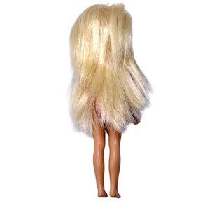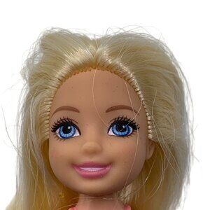 This Mattel Chelsea 2016 Blonde Doll dressed in a mermaid swimsuit is ready for fun at the Barbie Beach Club. At 5.5" tall, she sports a cute logo and vibrant blue and pink colors.