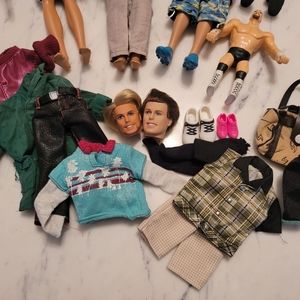 Lot of 9 Male Mattel action figures with 2 extra heads,some extra clothes and shoes! and a small bag