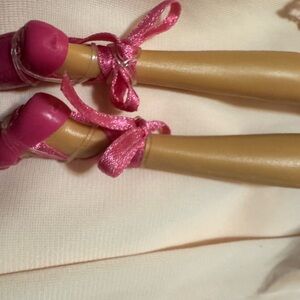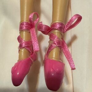 She wears ballet shoes secured with ribbons. 🎀