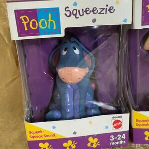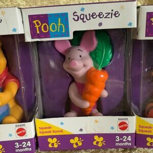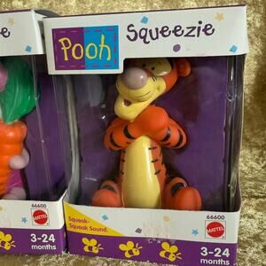 The Mattel Pooh Squeezie Collection from the 2000s features a set of beloved characters from the Hundred Acre Wood: Winnie-the-Pooh, Tigger, Rabbit, Piglet, and Eeyore. These adorable toys are new and sealed in their original box, making them a perfect addition to any Winnie-the-Pooh collection or a delightful gift for fans of all ages.