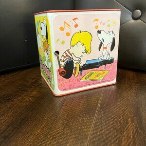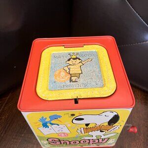 This vintage 1966 Mattel Snoopy Peanuts Jack in the Box tin toy is in working condition. It features Snoopy popping up when the crank is turned, along with colorful Peanuts graphics on all sides of the tin. The toy shows minimal wear consistent with its age, including light surface marks and patina, but remains fully functional. Please see photos for details.