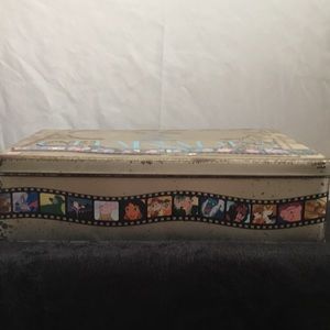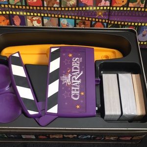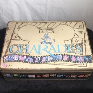 Mattel The Wonderful World of Disney Charades Game. Metal box does have some rusting, due to age. Circa 1999. Includes game board, 250 charade cards ( 200 general cards and 50 easy cards), 30-second electronic musical plastic clapboard timer/card dispenser, and two plastic Mickey Mouse feet movers. Good pre-owned vintage condition.