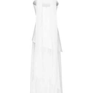 This elegant strapless dress features a structured top paired with a flowing chiffon layer. The long, sheer fabric adds movement, while the side slit gives the dress a dynamic feel. Designed for upscale occasions and special moments.