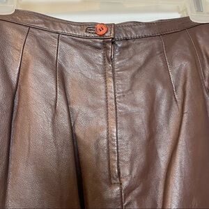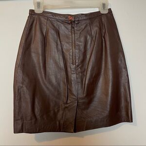 Matters of Degrees 100% all leather and polyester lined very on trend for the fall/ winder 2022/2023 seasons chocolate brown skirt. Back zipper and button closure. Pleated in both front and back. Size Petite 6 . Measurements are 13 1/2” waist 18” long. (B88/5-13 )