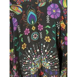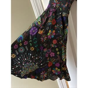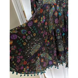 This is a colorful Matthew Williamson silk dress in size 4 with a V-neckline, long bell sleeves, and a tassel hem. The dress features a floral pattern, a contrasting trim, and a zipper closure. It is lightweight, sheer, and perfect for summer, fall, or spring occasions such as travel, parties, casual outings, or formal events. The kaftan kimono style with a sash belt gives it a bohemian chic vibe, making it a statement piece for any wardrobe. Waist is 24 inches it is 26 inches long approximately English sz 8 US sz 4 but would fit sz 2