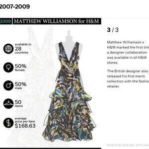 The dress has a tiered ruffle maxi dress with a colorful abstract print. It is part of the Matthew Williamson for H&M collection, which was launched in 2009. The collection featured a range of pieces inspired by Williamson's archives, including a beaded ruffle gown in a "tiger butterfly print".