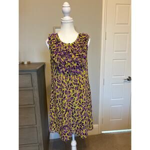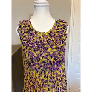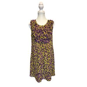 Stunning Matthew Williamson for Impulse dress! This sheath dress features a unique chartreuse and purple ruffle design that is sure to turn heads. Perfect for a special occasion or a night out. Grab this dress today and add a touch of luxury to your wardrobe!