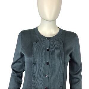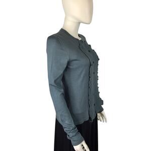 This lightweight cardigan sweater has a front ruffle and is a snog fit. Please note measurements.