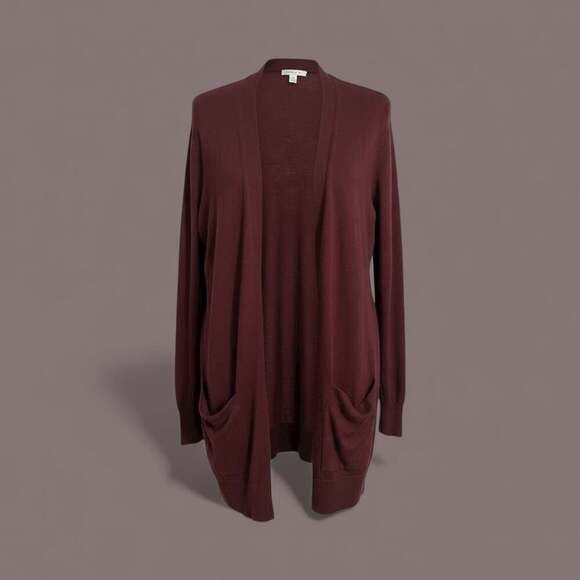 Matty+M burgundy open cardigan, perfect for layering. This versatile piece features a comfortable open-front design and practical front pockets. A great addition to any wardrobe for effortless style. Excellent pre-owned condition, no visible flaws.