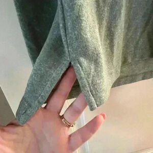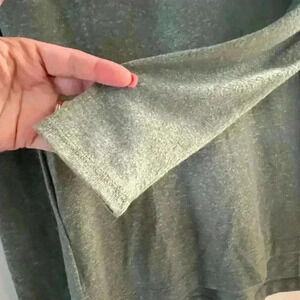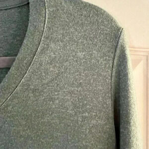 So soft and cozy! Rayon, spandex and polyester blend. Oversized small. Very pretty light green. Wear with leggings or jeans! Great condition! No rips or stains, gently used.