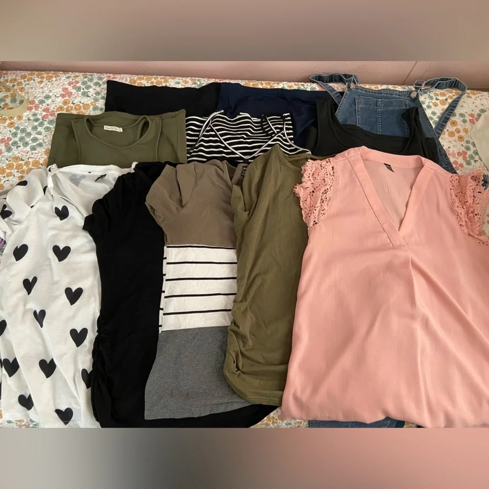 Five tops, three dresses, two jeans, and a pair of overalls. Sold together as a bundle. All sizes are on the images. Black pants are also size Large. All items are maturity wear.