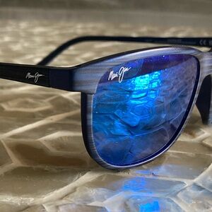 Maui Jim LELE KAWA sunglasses are a stylish choice for those seeking an irregular frame shape. The dark blue matte frames perfectly complement the blue mirror polarized lenses, while adding a touch of sophistication to your look. These unisex shades offer both comfort and style, making them ideal for everyday wear.