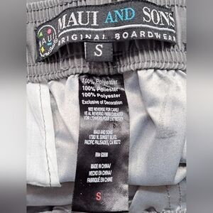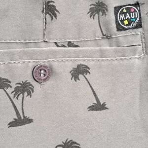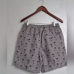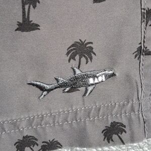 grey & black palm trees, elastic waistband with outside drawstring, two front pockets, embroidered shark at the bottom, 100% polyester, back welt pocket, waist 31" inseam 6.5", small spot (see pic)
