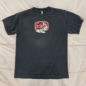 This t-shirt is faded, and designs show wear. It is a size medium and measures about 20" from armpit to armpit.