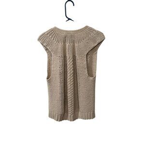 This sleeveless knit vest with an open front design offers a breathable yet stylish layering option. Crafted with a luxurious silk and cotton blend for a soft, lightweight texture. Neutral tan color makes it versatile for various outfits and occasions.