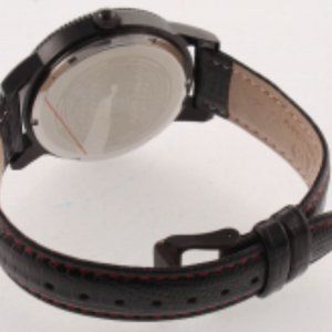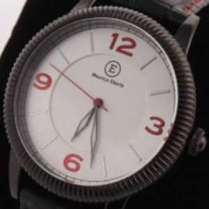 The Maurice Eberle Men's Watch features an ion-plated black case, 3ATM silver dial, and black polyurethane leather strap with red stitching. Please see photos for details.
