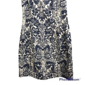 Maurie & Eve for Scoop damask floral sheath dress. Cream off white background with all over blue print. Semi fitted. Back zip closure.