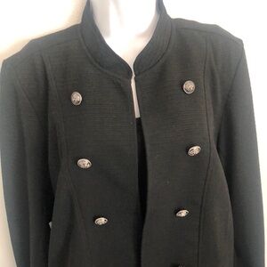 Black Military Style Opened Long Sleeve Blazer! Featuring side pockets an Black and White Stripe Lining. New without Tags. Fits Medium/ Large.