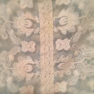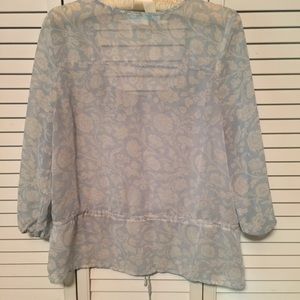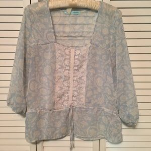 Shear polyester top with 3/4 sleeve and tie at waist.