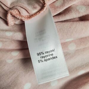 Cute and comfy pink tee with white polka dots. Features scoop neck, short sleeves, and a soft stretchy rayon/spandex blend for a flattering fit.