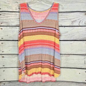 Maurices 24/7 women’s sleeveless top, size XL. Multicolor Aztec stripe pattern in coral, yellow, taupe, and light blue tones. Soft stretch knit for a relaxed, flowy fit—perfect for summer or layering.