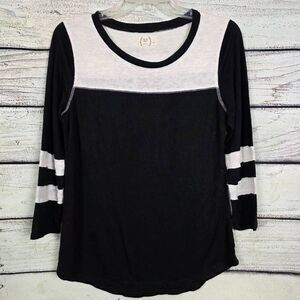 Maurices 24/7 women’s top, size Small. Classic black with white contrast yoke and sporty striped sleeves. Lightweight and soft stretch knit—great for layering or everyday casual outfits.