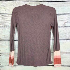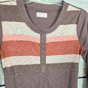Maurices 24/7 women’s Henley-style top, size XS. Features mauve, pink, ivory, and rust colorblock stripes with button front detail and long sleeves. Soft ribbed stretch knit fabric for cozy everyday wear.