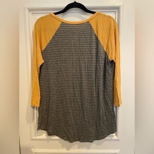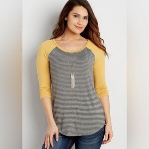 Maurices 24/7 Soft Gray & Black Stripes w/ Yellow 3/4 Sleeves Baseball Tee Large
