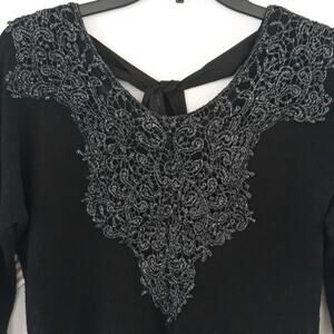 This beautiful black shiny design poly/rayon/spandex shirt with 3/4 sleeves has a high low hem and a ribbon that ties into a bow on back. Glittery silver decorative lace pattern neckline. Oversized feel - roomy. Great for any dressy occasion, girl's night out, or black tie affair. Soft and comfortable.