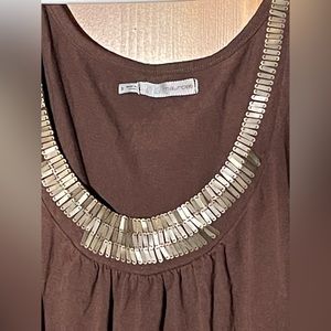 Brown Sleeveless Tank, Pleated, Beaded Detail Around Neck, Elastic Waist 62% Poly, 33% Rayon, 5% Spandex, PTP 30, L 32