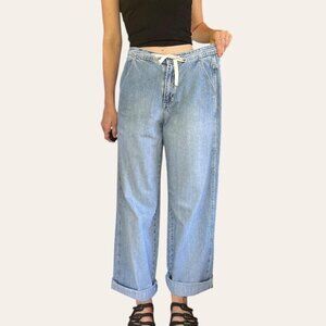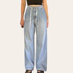 90s vintage baggy drawstring jeans by Maurice’s. Light wash grunge boyfriend fit high waisted jeans with a straight leg baggy fit and a built-in shoelace drawstring. So cute and perfectly slouchy.