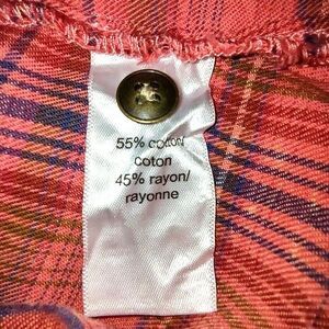 Maurices Aged Red Plaid Button Front Shirt Womens Size S. This button front shirt is red in color but has an intentional fading or aged appearance that makes it all the more interesting. It has long sleeves with buttoned cuffs. The fabric is 55% cotton and 45% rayon, and it is soft and lightweight. Measurements lying flat: armpit to armpit 18", length from shoulder to bottom hem 26". Preowned with light wear and no flaws noted.