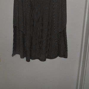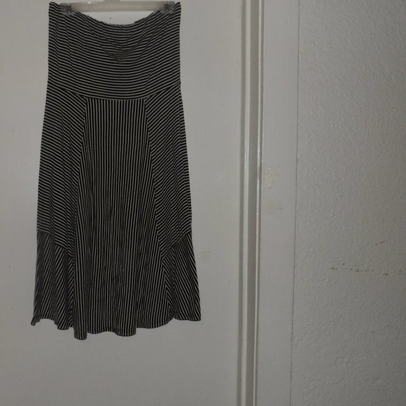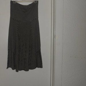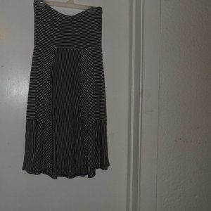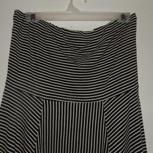 strapless, tshirt like material is 63% Rayon 37% Polyester , dress is varieated stripes of white and either dark navy or black ( I cant differentiate due to cataracts apologies) , size L measurements are roughly 33" from shoulder to hem and about 15" pit to pit , decent wearable pre owned condition no holes or stains, pet friendly non smoking home.