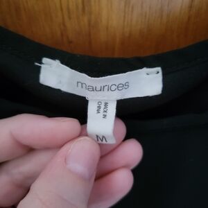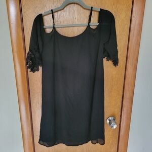 Elevate your wardrobe with this Maurices black cold shoulder dress, a flattering and versatile piece in excellent used condition. It features chic cut-out shoulders, a lightweight sheer overlay, and delicate lace trim along the sleeves.