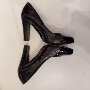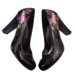 Maurices Black LOVE Tatoo High Heels size 8 Shoes Faux Patent Leather Pumps