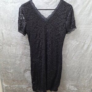Pre-loved black lace dress from Maurices, size Small. This fitted silhouette features a delicate floral lace overlay, short sleeves, and a V-neckline. It shows noticeable wear (see photos) but still has styling potential. Great for layering or casual glam looks.