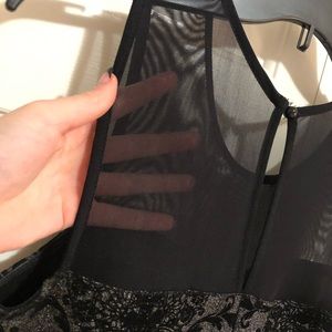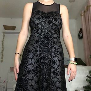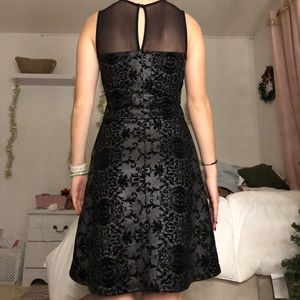 This halter style dress is perfect for a small party or event. Very thick material and has a dull sparkle under the black. I wore it once and never had another thing to wear it too.