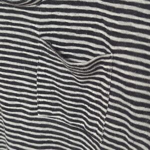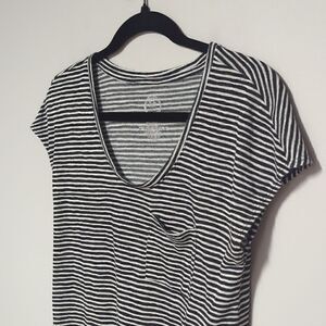 White and Black striped Cap Sleeve Shirt. V neck, small pocket